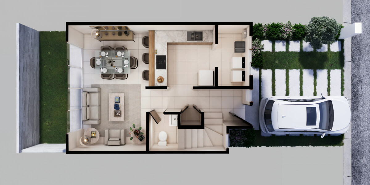 Con el prototipo Aura Premier, disfruta de espacios equilibrados que optimizan cada centímetro de tu nuevo hogar. Su ventanal en la sala-comedor maximiza la iluminación y ventilación natural, creando un ambiente fresco y luminoso. Descubre estos acogedores espacios, pensados para transformar tu casa en el hogar que siempre quisiste.